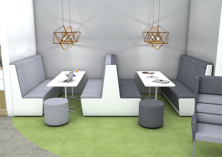 Luna Booths draw inspiration from banquette seating but add a distinctive design twist to cater for the modern workspace environment.